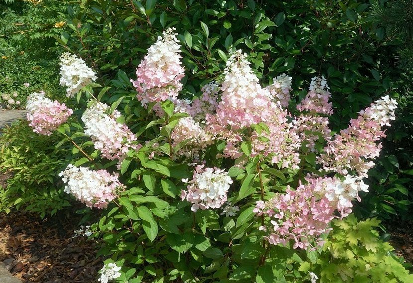 - Цветение: Гортензия Конфетти радует глаз крупными соцветиями, которые меняют окраску в течение сезона. В начале цветения они белоснежные, затем постепенно приобретают розоватый оттенок.